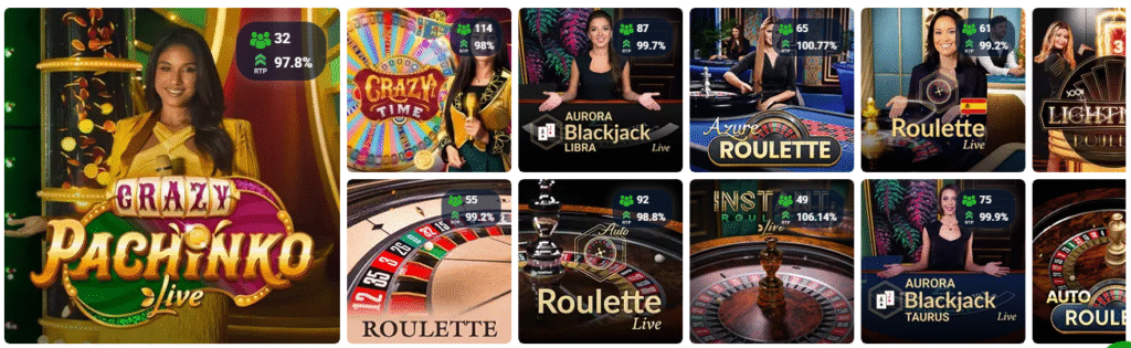 La oferta incluye una amplia variedad de mesas de ruleta, blackjack, baccarat y programas de juego (game shows) con diferentes límites de apuesta y versiones localizadas, como ruletas en español. Los proveedores destacados incluyen Evolution Gaming, Pragmatic Play Live y Ezugi, reconocidos por su calidad de transmisión y fiabilidad.