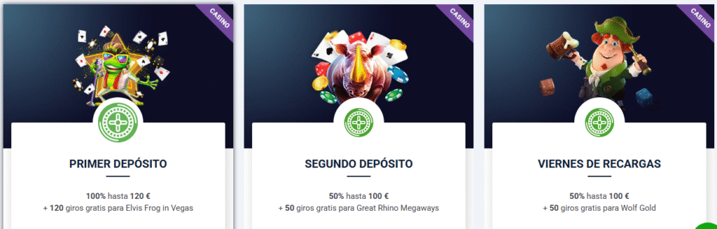 | Primer depósito | 100% hasta 120 € | 120 giros | Elvis Frog in Vegas |