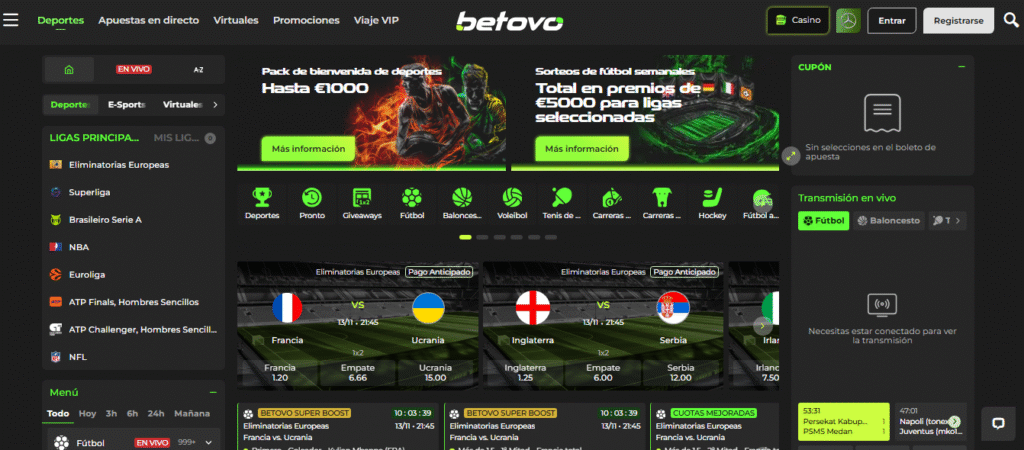 Betovo Casino cuenta con una sección deportiva muy completa que permite apostar en cientos de eventos diarios de ligas internacionales, competiciones locales y torneos en vivo. La plataforma ofrece cuotas competitivas, mercados amplios y funciones adicionales como transmisiones en vivo, super boosts y apuestas anticipadas. Su interfaz está diseñada para que los usuarios puedan navegar fácilmente entre deportes, estadísticas y opciones de apuesta, tanto desde ordenadores como desde dispositivos móviles.