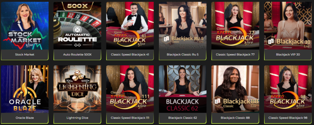 El casino en vivo de Betovo ofrece mesas profesionales con crupieres reales y una variedad de juegos como ruleta, blackjack y dados con funciones multiplicadoras. Entre las opciones disponibles destacan Auto Roulette 500X, Lightning Dice, Stock Market Live y numerosas mesas de Classic Speed Blackjack. La experiencia es fluida, con alta calidad de transmisión y límites adaptados tanto a jugadores principiantes como avanzados.