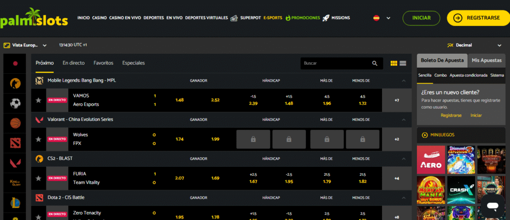 La sección de apuestas deportivas de Palm Slots Casino está diseñada para jugadores que buscan una plataforma completa, con mercados amplios y cuotas competitivas. El sitio ofrece una navegación clara, acceso rápido a eventos en vivo y una gran variedad de disciplinas, que van desde deportes tradicionales hasta e-sports y competiciones internacionales. Además, permite realizar apuestas simples, combinadas y sistemas, adaptándose tanto a principiantes como a usuarios experimentados.
