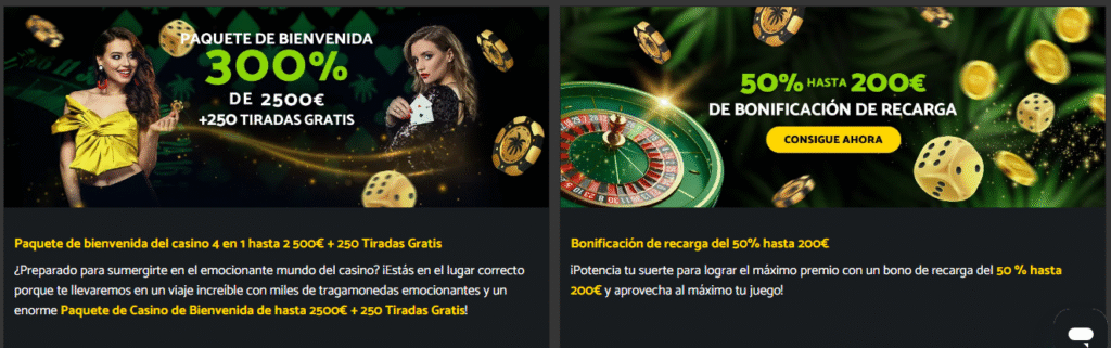 | Paquete de bienvenida | Hasta 300% de 2.500€ + 250 tiradas gratis (bono 4 en 1 para nuevos jugadores). |