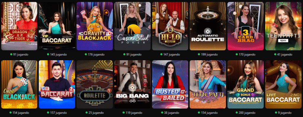 El casino trabaja con proveedores líderes como Evolution Gaming, Ezugi y Pragmatic Play Live, garantizando una experiencia fluida, segura y totalmente interactiva. Las partidas permiten apostar en tiempo real, conversar con los crupieres y competir con otros jugadores, todo dentro de un entorno moderno y optimizado para móvil y escritorio.